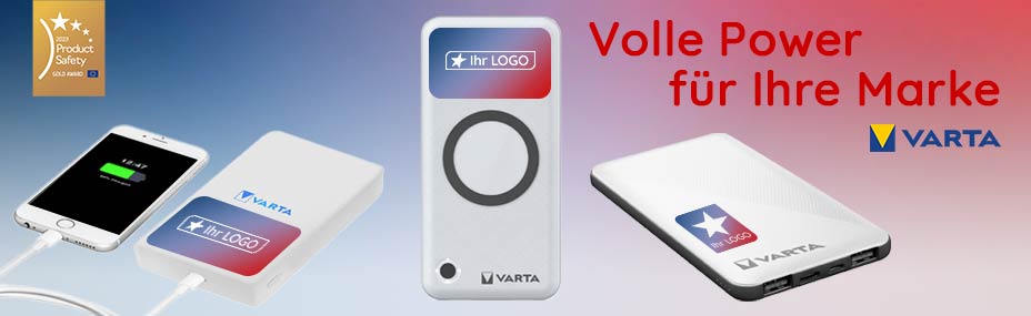 VARTA steht seit Jahrzehnten für zuverlässige Energieprodukte und höchste Qualitätsstandards. Mit einer VARTA Powerbank mit Logo setzen Sie auf eine starke Marke, die Vertrauen schafft und im Alltag echten Mehrwert bietet. Gerade im mobilen Zeitalter sind leistungsstarke Zusatzakkus gefragter denn je – als praktischer Begleiter im Büro, auf Reisen oder bei Events. Hier finden Sie ausgewählte VARTA Powerbanks zum Bedrucken, die sich ideal als hochwertiger Werbeartikel eignen. Durch die individuelle Veredelung mit Ihrem Firmenlogo verbinden Sie technische Qualität mit nachhaltiger Markenpräsenz. So bleibt Ihr Unternehmen immer dann im Blick, wenn Energie gebraucht wird.